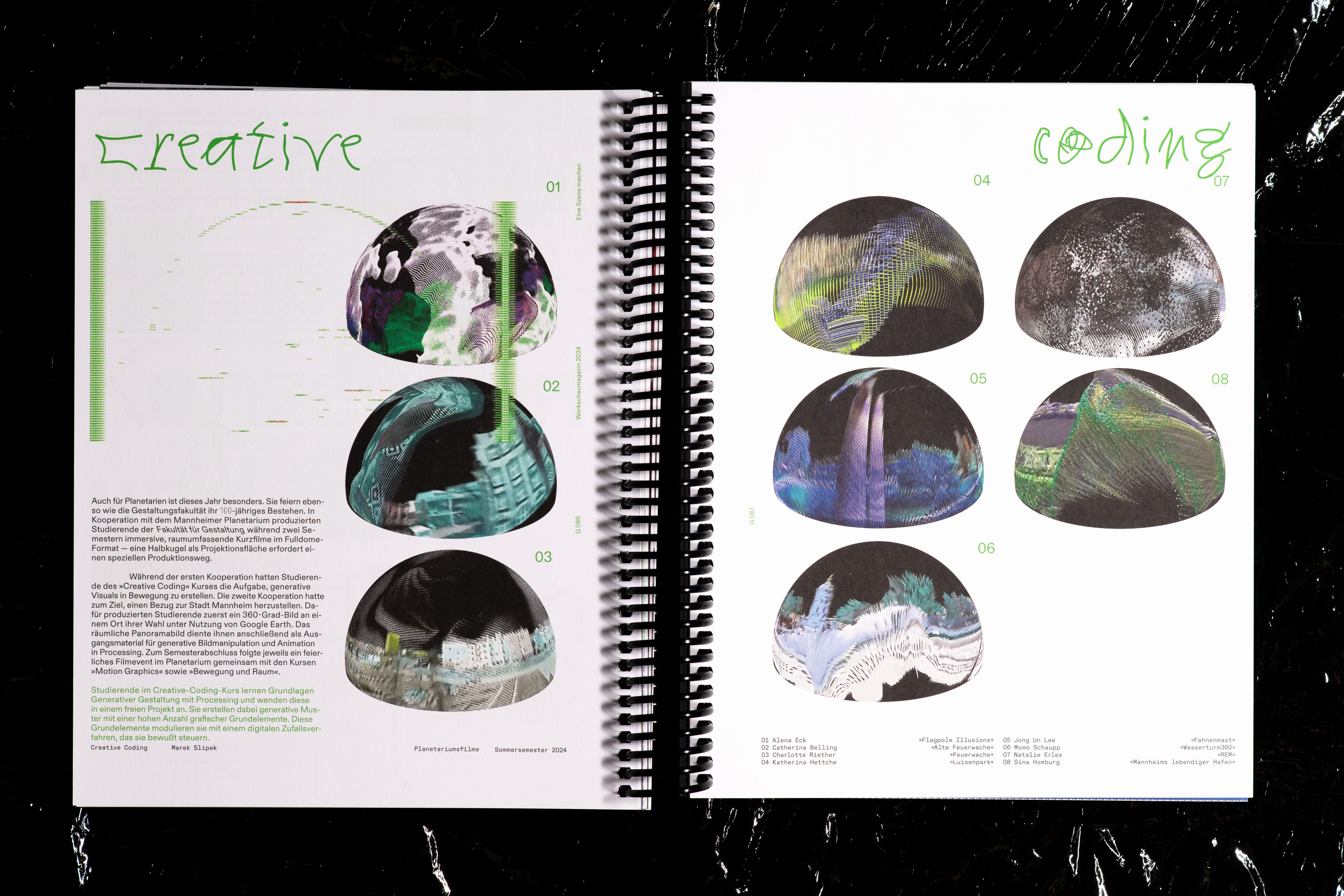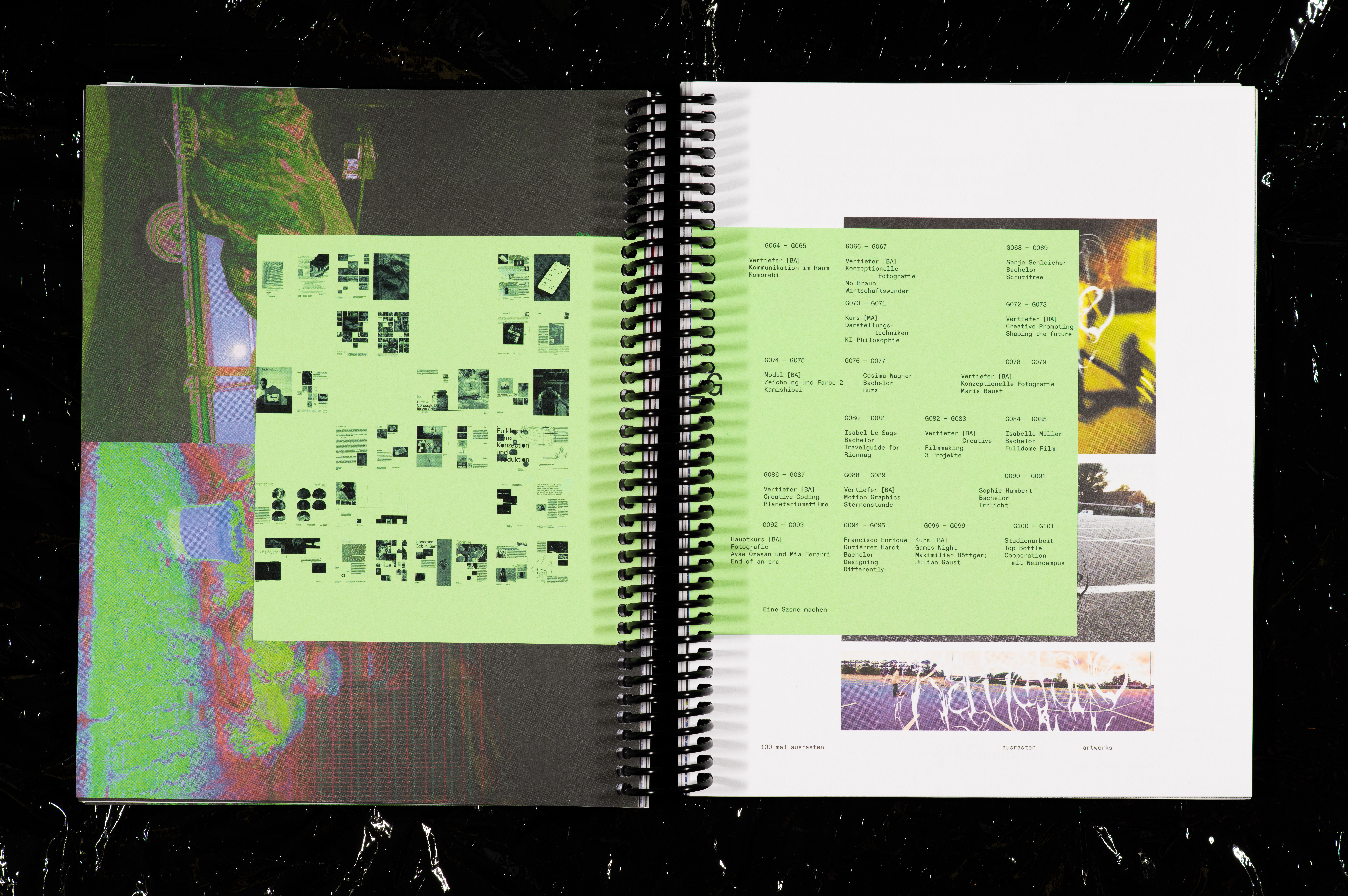 Spanning 152 pages under the theme “RGB and Freaking Out,” the publication offers insights into courses, highlights the best bachelor’s and master’s thesis projects in communication design, and looks to the future. The idea of “freaking out” doesn’t just symbolize the 100-year celebration but can also be taken literally—breaking out of the grid. Typography plays a subtle role in this rebellion, causing disruptions without losing clarity in its design.